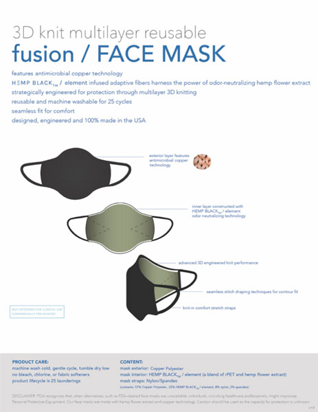 The mask is a 3-ply cotton construction made using a 4-ounce knit jersey fabric that is finished with an antimicrobial silver and copper-based chemistry. Warlick is quick to point out however, that the mask is not intended for medical environments and the companies involved do not make any claims about antiviral protection or infection prevention or reduction, among other claims. “If we could have made N95 masks, we would have made N95 masks,” Warlick said. “But that wasn’t possible. So, we’ve done the next best thing we could do, which is to offer another level of protection.